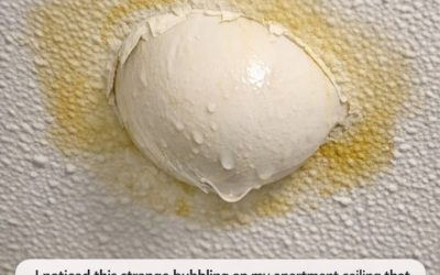 I noticed this strange bubbling on my apartment ceiling that feels damp when I touch it. The upstairs tenant says they don't have a leak, but it looks like it's about to burst. What would you do?
