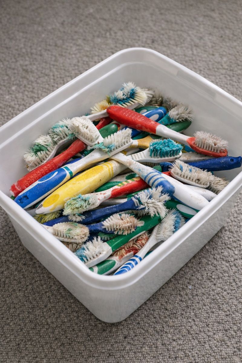 Old toothbrushes are perfect for cleaning grout and tiles. Their small size allows them to get into the narrow spaces between tiles, where dirt and mold tend to build up. Use a mixture of baking soda and vinegar or a store-bought grout cleaner. Dip the toothbrush into your cleaning solution and scrub the grout lines, applying firm pressure to remove grime. The bristles are stiff enough to dislodge dirt but gentle enough to avoid scratching surfaces. In areas like bathroom corners or around faucets, where larger brushes can't reach, an old toothbrush can make a significant difference.