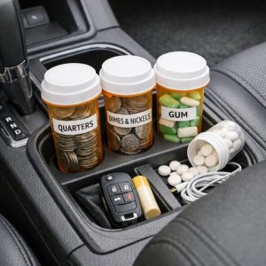 Keep your car’s console tidy by using pill bottles to organize coins for tolls or parking meters. You can also store other small essentials like gum, mints, or earbuds. This method not only reduces clutter but also ensures that everything you need is within easy reach while driving.